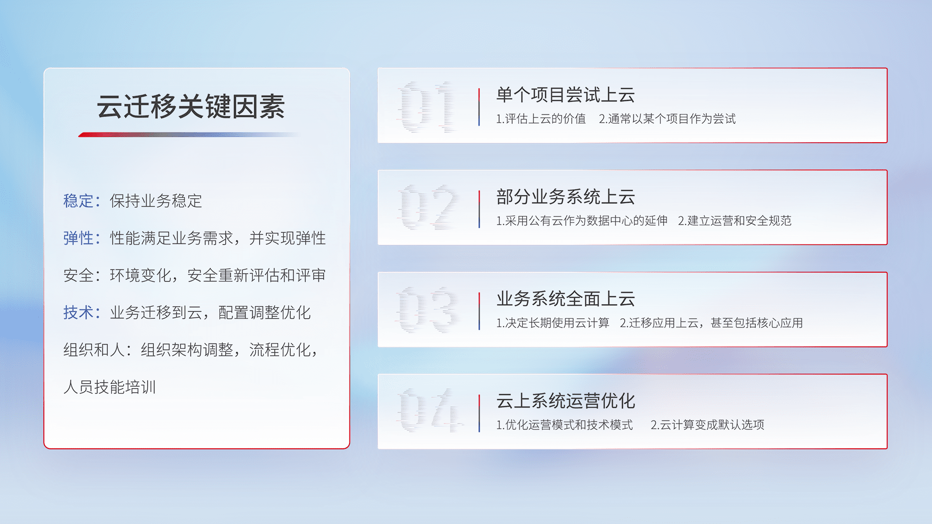 结合实际业务,,,从规划设计、、、云平台选型、、、、云原生改造、、、数据迁移、、集成交付,,,迁移全过程为客户识别最佳上云路径,,,做好风险识别管理,,设计网络架构、、身份权限、、安全审计合规、、操作审计、、、日志审计、、、监控告警策略、、多站点容灾设计等,,,对云上基础设施进行整体规划,,,,提升IT治理水平,,,以满足弹性、、、高可用、、、、高性能的需求。。