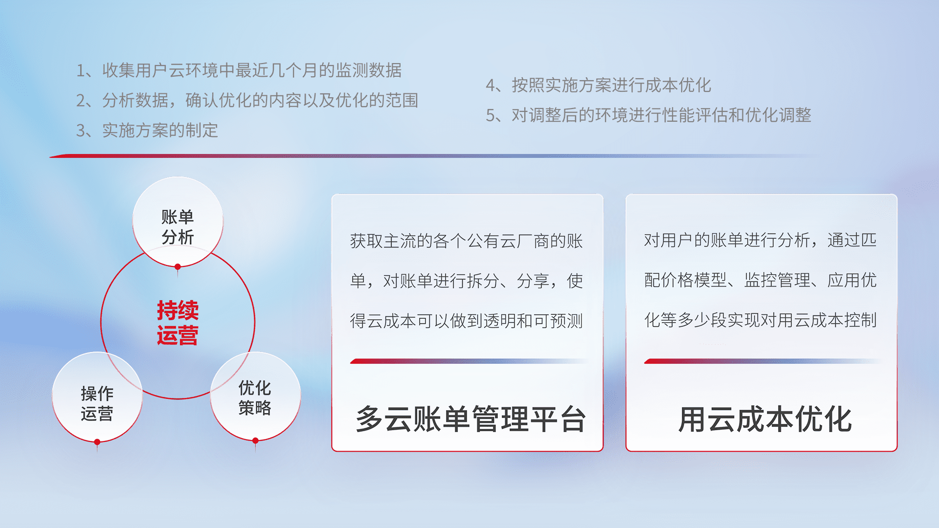 通过多云纳管,,以统一的资源数据模型把客户的云资源进行抽象和封装,,,进而实现对多云资源的统一操作,,,,保障云资源管理的可靠性、、、稳定性与可用性。。量身定制化运维内容,,配置、、开发运维、、、补丁管理、、、、备份、、、、监控、、、、认证和访问管理、、审计和日常巡检等,,,保障在用云过程中的可靠度,,稳定度以及高可用率。。。。